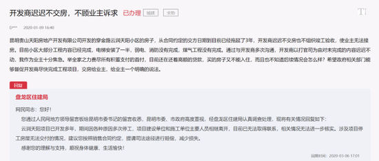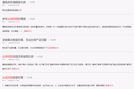 9月,在人民网干群互动平台《领导留言板》上又出现关于云润天阳楼盘多年未交房的反映。