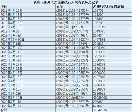 也是从2018年4月开始,贵山天阳频繁登上失信被执行人名单,涉及案件24个,未履行执行标的总额超过7754万元,公司法定代表人、执行董事兼总经理的黄伟培,持股51%的第一大股东昆明天阳企业集团有限公司,以及实际持股30%的另一最终受益人惠煌程均被列入失信被执行名单,黄伟培和惠煌程也被限制消费。