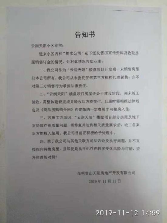 实际上,(2016)云0103民初4565号判决书披露,早在2016年7月,已有业主因逾期交房而将贵山天阳诉至法庭,两个月后法院判决贵山天阳向业主支付约102万元首付款本金及利息。今年1月,在人民网(18.690,-0.13,-0.69%)干群互动平台《领导留言板》上,也有网友反映云润天阳楼盘延迟3年交房、未完全竣工的情况,得到昆明市盘龙区住建委的确认称,该项目已开发多年,期间因各种原因多次停工,项目建设单位和施工单位主要人员相继离开且失联。