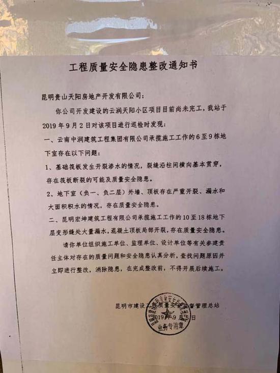 业主们还担心房屋可能存在质量问题。根据业主提供的材料,2019年9月,昆明市建设工程质量安全监督管理总站对贵山天阳发出《工程质量安全隐患整改通知书》,称巡检时发现,云润天阳10余栋楼房地基础筏板和地下室存在开裂、严重渗水等问题,要求立即整改。