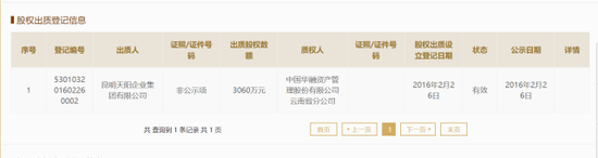 作为李贵山的合伙法人、贵山天阳第一大股东,昆明天阳企业集团有限公司同样陷入官司,多作为贵山天阳所涉房屋纠纷的共同被告。不过更值得注意的是,早在2016年2月,天阳集团就将持有的贵山天阳股份出质给中国华融资产管理股份有限公司云南省分公司,数额达到3060万元,与天阳集团实缴额一致。同年8月,天阳集团股东及法定代表人惠煌程又将数额4697万元的股权出质,出质股权总额达到7757万元。