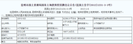 2013年1月30日,“云润天阳”楼盘所属地块以4.2135亿元底价被贵山天阳拍下。根据公开土地拍卖资料和昆明市住建局发布的2014年10月建筑工程施工许可证核发情况表,该地块土地面积为62296.01平米,建筑面积达232655.94平方米。按规划,地块分3部分开发,一号地块含1栋公寓和4栋商业,二号地块为2栋高层住宅及2栋板式洋房,三号地块共11栋花园洋房,共20栋楼,商住一体,总户数超900户,2014年底已动工。