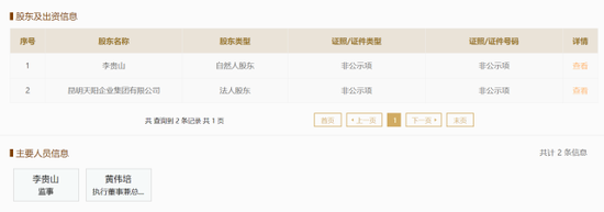 国家企业信用信息公示系统及天眼查等第三方平台显示,贵山天阳注册资本6000万元,共有两个股东,第二大股东为李贵山,属自然人股东,持股49%,实缴出资额2940万元,并担任公司监事。