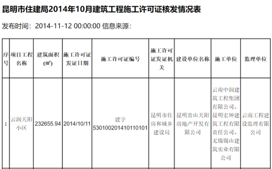 耐人寻味的是,2014年8月,云润天阳项目相关负责人向网易房产云南站表示,天阳集团长期从事食品、化工等实业,现金流较充足,房地产开发只是支线,称云润天阳1号地块已提前好几个月封顶,2014年内整体封顶,2015年年中左右可以交房。而根据昆明市住建局的公开信息,云润天阳小区项目的施工许可证发证日期为2014年10月11日。